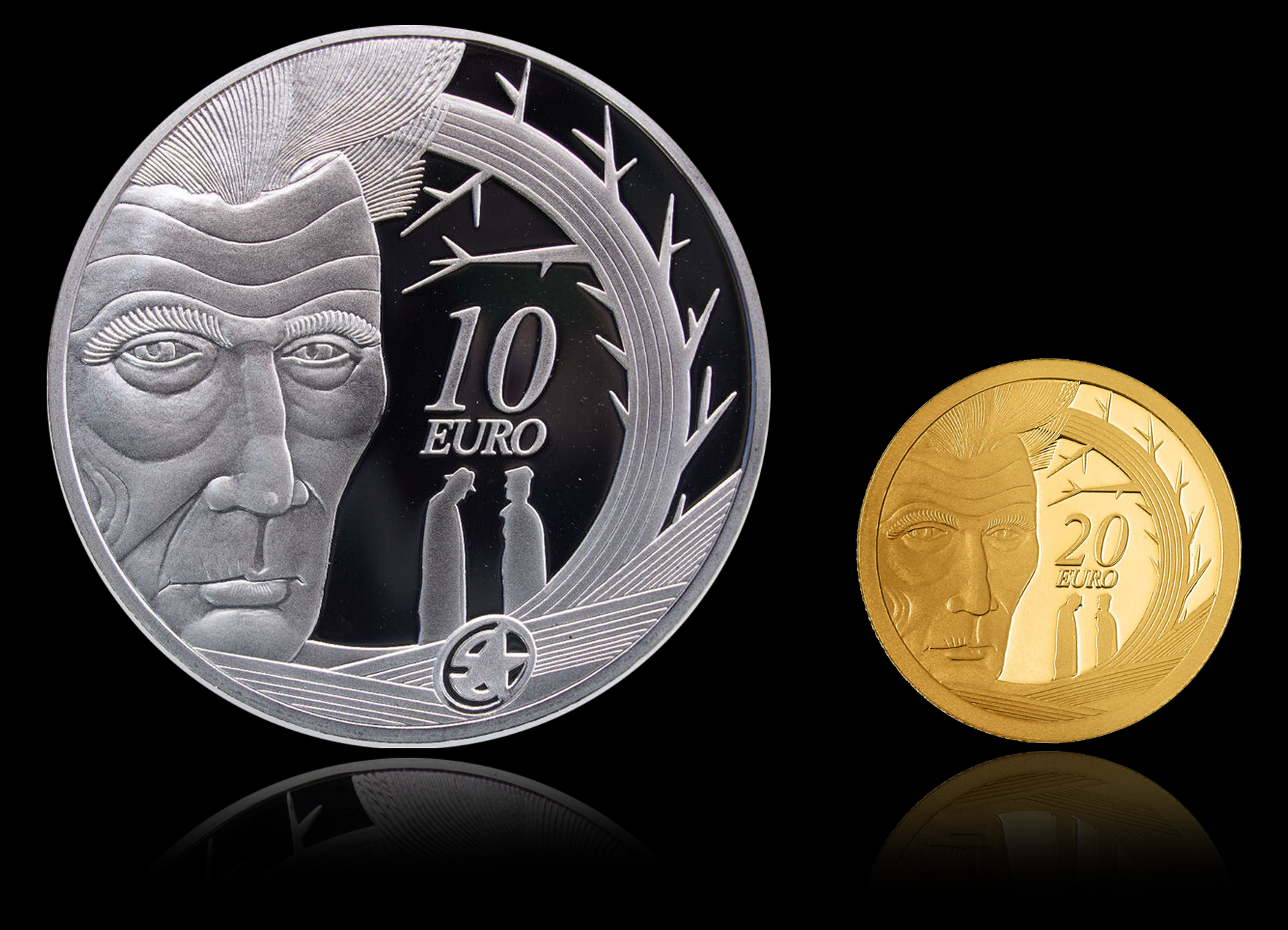 Celebrating one of Ireland's greatest writers, Samuel Beckett, with a scene from 'Waiting For Godot' and a portrait of the man himself. Two coins were minted by the Central Bank of Ireland; a €10 silver proof coin and a €20 gold proof.